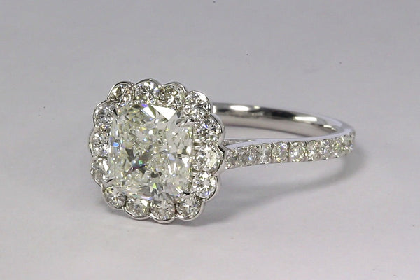 Platinum engagement ring featuring a GIA certified 1.86ct I-color SI1-clarity Cushion Brilliant Cut diamond surrounded by a halo designed as a flower. 63 G-color VS-clarity Round Brilliant Cut diamonds are set along the halo, shank, and under the head totaling 0.95ctw.