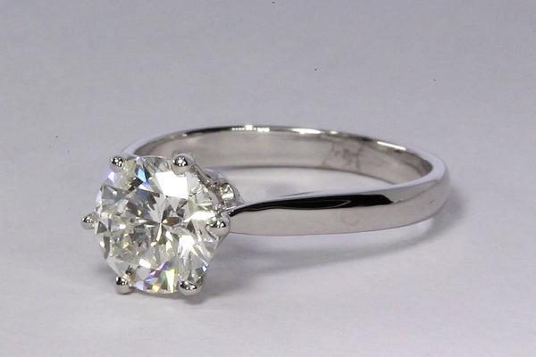 18K White Gold solitaire engagement ring featuring a 2.01ct H-color I1-clarity Round Brilliant Cut diamond set with 6 prongs.