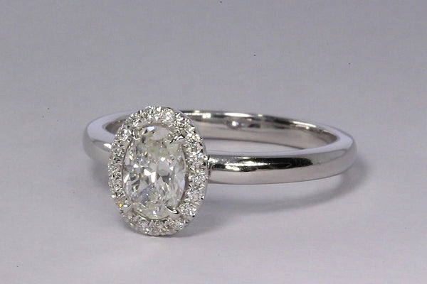 18K White Gold handmade engagement ring featuring a .68ct F-color SI1-clarity Oval Cut Diamond and a halo perfectly micropavé set with 18 F-color VS1-clarity Round Brilliant Cut Diamonds totaling 0.13ctw.
