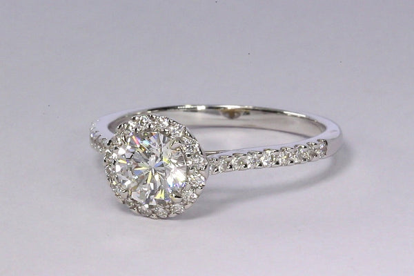 18K White Gold handmade halo engagement ring featuring a GIA certified .73ct E-color VS2-clarity Round Brilliant Cut diamond. Micropavé set in the halo and on the shanks of the ring are 34 F-color VS1-clarity Round Brilliant Cut diamonds totaling 0.28ctw.
