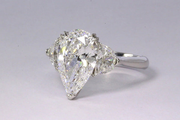 Platinum custom three-stone engagement ring with an airline featuring a EGL NY certified 3.08ct D-color SI1-clarity Pear Shaped diamond with two D-color VS-clarity half moon diamonds V and Claw style prong set on the sides totaling 0.93 ctw.