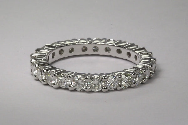 Shared prong eternity ring that features low profile, rounded baskets for maximum comfort and elegance. 23 I-color VS1-clarity round brilliant cut diamonds surround this eternity band totaling 1.80ctw. *Ring size will determine the exact diamond count and carat weight (size 6 shown).